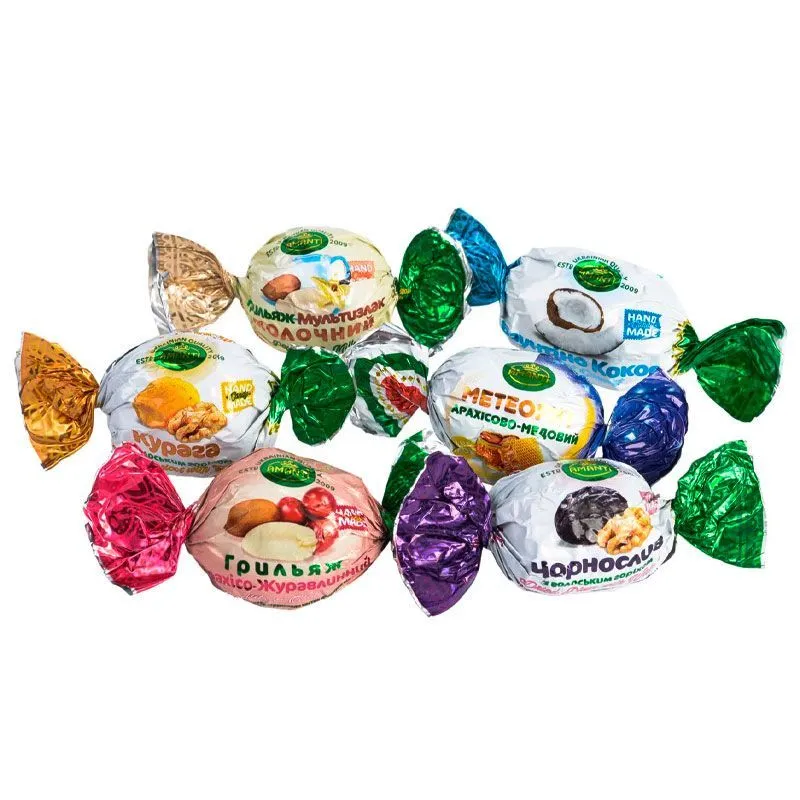 Какао масло; какао порошок; лецитин соевый (Е492-Е476); шоколадная глазурь; грецкий орех; курага; чернослив; кондитерская глазурь; фундук; финик; миндаль; кокосовая стружка; инжир сушеный; фракция гидрогенизированное пальмоядрового масла.