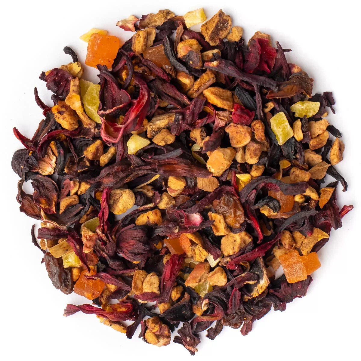 Каркаде, цедра апельсина , лист брусники, яблоко сушеное, изюм, боярышник, цукаты ананаса, цукаты киви, цукаты манго, цукаты папайе, сублимированная красная смородина, ароматические масла