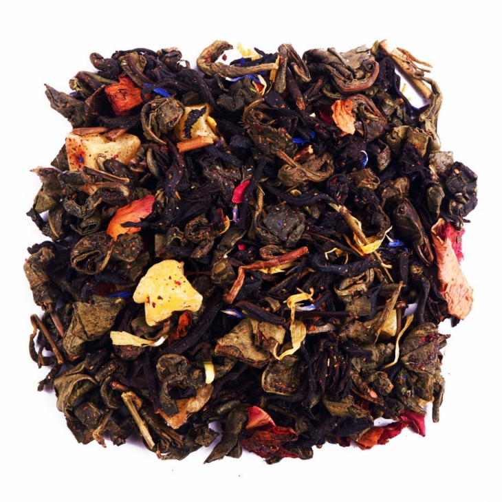 🌺 Ароматный купаж на основе индийского чёрного байхового чая, дополненный цукатами ананаса и манго, плодами шелковицы, а также изысканными цветами и ягодами: черноплодная рябина, бутоны жасмина, цветки граната, мальва и календула. Вкус глубокий, фруктово-ягодный с лёгким цветочным послевкусием.